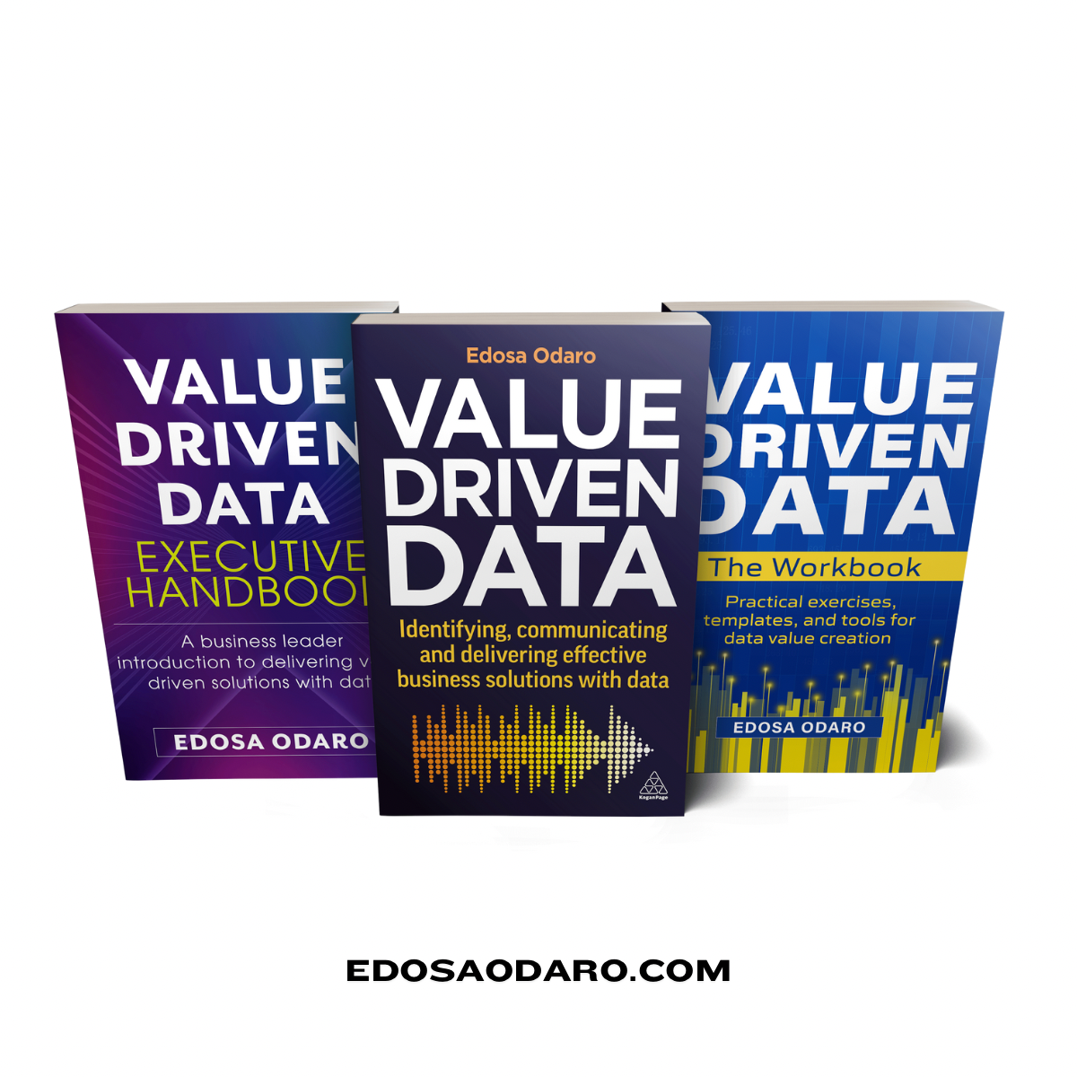 Beyond Making Data Work, Edosa has recent released Value-Driven Data focuses on the three simple things that under-pin the quest for unlocking value from data: vision, value and obstacles. Ultimately, this multivolume publication is a no-nonsense account of what it takes to unlock data value. Told through a combination of professional experiences and real-life case studies, it explains how data stakeholders can leverage value-driven opportunities for themselves, their organizations and society at large.